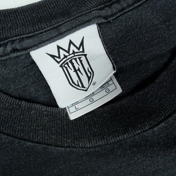着用感があり、ボディ全体に毛羽立ちや色褪せがあります。フロント裾付近にシミが複数あります。プリント部分にひび割れがあります。ヴィンテージ特有のダメージがあります。