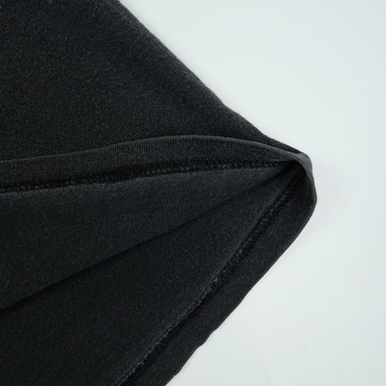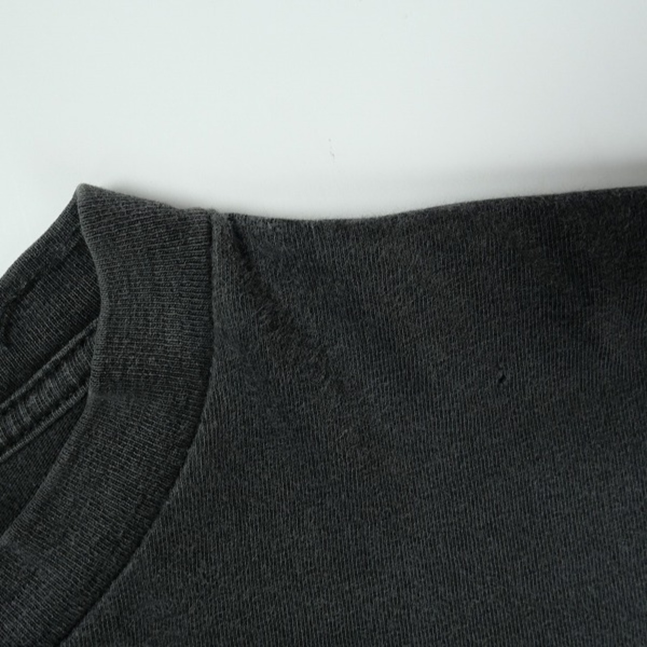 着用感があり、ボディ全体に毛羽立ちや色褪せがあります。フロントプリント付近と左肩に穴があります。プリントにひび割れがあります。