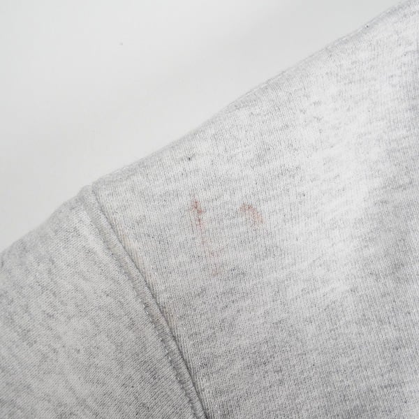 着用感があり、ボディ全体に毛羽立ちや色褪せがあります。袖口やフードのフチ部分に黄ばみがあります。右肩に汚れがあります。